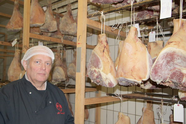 Daniel Brunin, chef d’atelier boucherie, devant les jambons de Meuse en pleine maturation (©Pleinchamp)